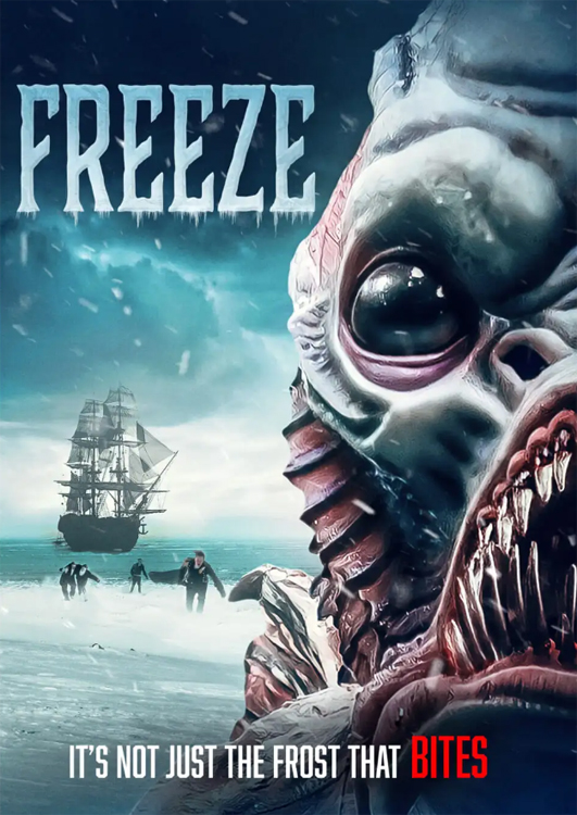 From Dark Temple Motion Pictures comes FREEZE, the latest horror movie from director Charlie Steeds (THE BARGE PEOPLE). Starring Johnny Vivash, David Lenik, Ricardo Freitas, Jake Watkins, Rory Wilton, and Tim Cartwright, the Lovecraftian horror film follows a rescue mission to the North Pole, spearheaded by Captain Mortimer (Wilton) to retrieve an old friend and his lost expedition crew. But he gets more than he bargained for when his ship is frozen into the ice sheet and set upon by bloodthirsty fish-creatures. Mortimer and his surviving crew flee the ship, beginning a treacherous journey to find safety in a frozen, desolate wilderness. Suffering from starvation, frostbite, and a slow madness, they find shelter inside a snowy mountain, but… are they as safe as they think, or have they entered the heart of the creatures lair?