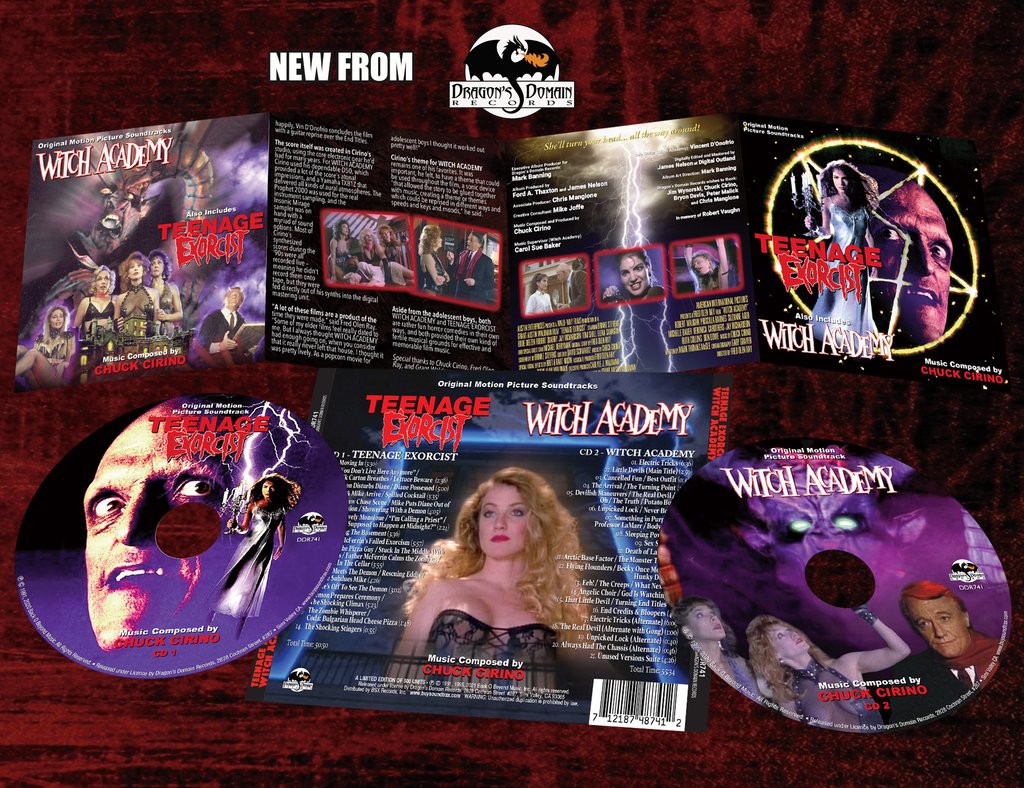 Dragon’s Domain Records, to be distributed through buysoundtrax.com, presents music composed by Chuck Cirino for TEENAGE EXORCIST (1991) and WITCH ACADEMY (1994), two horror comedies from the composer’s extensive filmography. TEENAGE EXORCIST stars Brinke Stevens, Eddie Deezen, Robert Quarry, and Michael Berryman in a story of a neurotic, repressed grad student who moves into a cursed mansion and finds herself possessed by the house’s demonic master. Transformed into a raven-haired seductress, Diane begins to search for a virgin sacrifice for her master. WITCH ACADEMY, also known as LITTLE DEVILS, was directed by Fred Olen Ray and stars Michelle Bauer, Suzanne Ager, Ruth Collins, and Veronica Carothers with extra star power added via Priscilla Barnes (best known for THREE’S COMPANY) and Robert Vaughn (THE MAN FROM U.N.C.L.E.) as The Devil. It’s a seductive comedy about members of an exclusive college sorority coven who seek twisted new ways to humiliate a new pledge, but The Devil has other ideas. Both films feature fun and exciting scores by prolific composer Chuck Cirino.