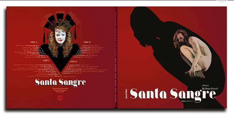 Composer Simon Boswell announces the forthcoming extended double-vinyl soundtrack of his score to SANTA SANGRE. The is the Composer’s 30th Anniversary Edition featuring 78 minutes of music, including the complete score, previously unreleased cues, songs performed by cast, and—for the first time ever—all of the music recorded on the set of the film in Mexico City, PLUS new orchestral versions by Simon Boswell and the Gringo Orchestra.