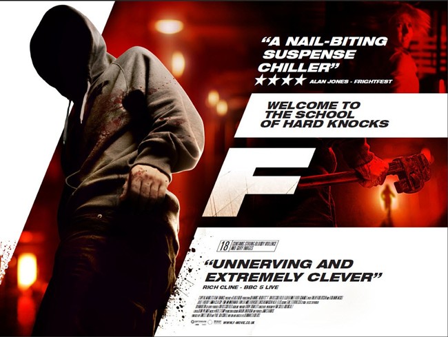 A taut thriller by the name of “F” came out in England in 2010. The film is a new entry in the growing subgenre of “hoodie thrillers” in which innocent protagonists are menaced by hooded sweatshirt-wearing youths – the French film ILS (THEM), the British films EDEN LAKE and CHERRY TREE LANE, and the recent Irish film CITADEL are other notable examples. “F” is unusual in that its protagonist, unlike the damsel in distress in films like P2 and others, is a middle aged male schoolteacher menaced by a gang of hooded toughs after he gives an anti-social student an F grade. The film is a well-paced and very well directed thriller, effectively resolved, supported by a very creepy score by Neil Stemp.